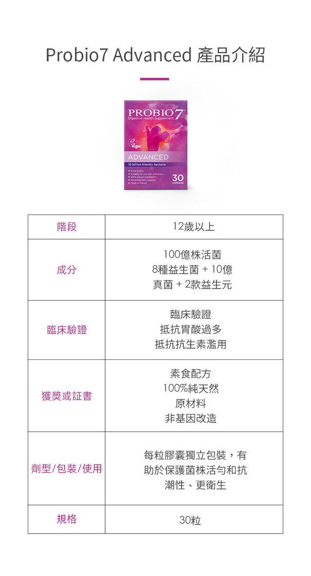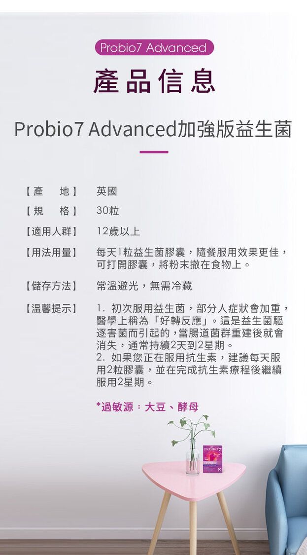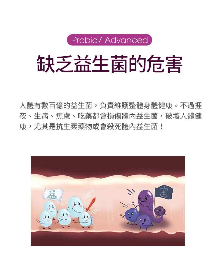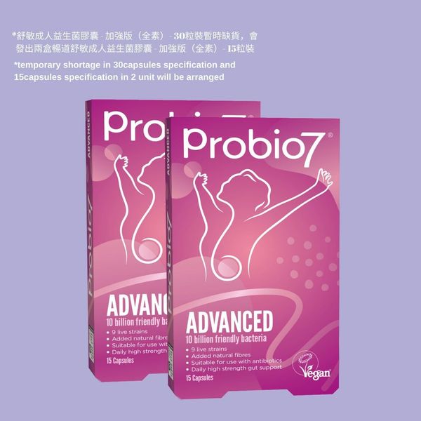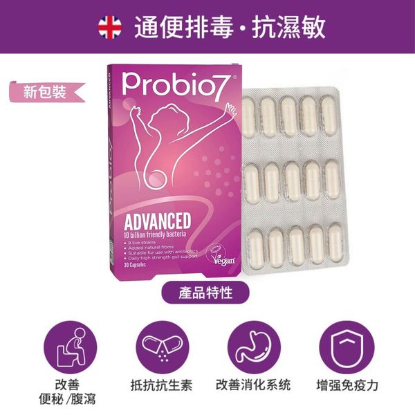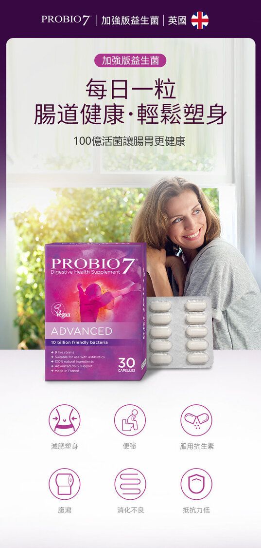 Probio7 暢道舒敏成人益生菌膠囊-加強配方(全素)專為成人而設,有效促進腸道平衡,維持免疫及消化系統健康。Probio7 Advanced蘊含9種經科研實證的益生菌及2種益生元,幫助促進益生菌生長,每顆膠囊的益生菌含量達100億,醫學證實對人體安全健康。
