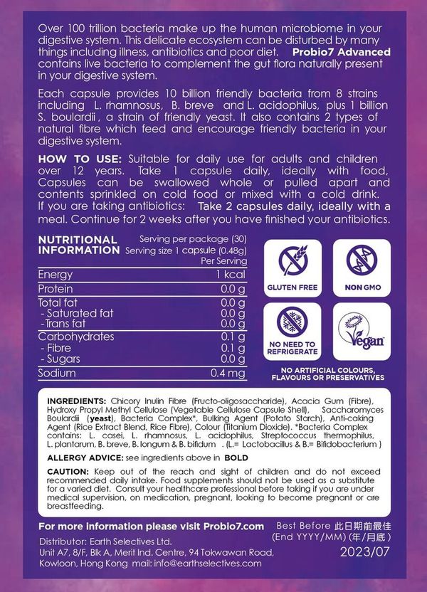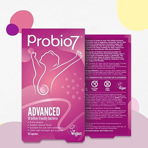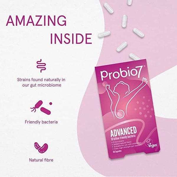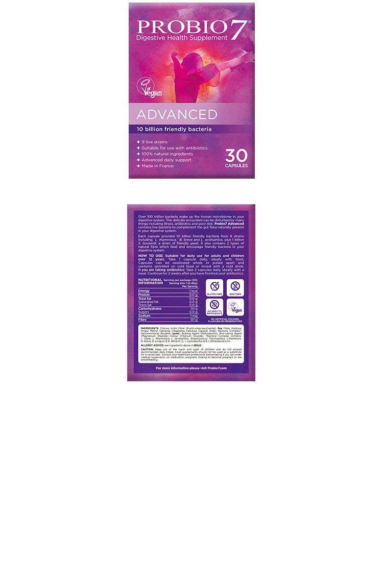 - Probio7 Advanced is a high strength digestive health supplement with 10 billion friendly bacteria per capsule and contains 2 types of natural fibre.